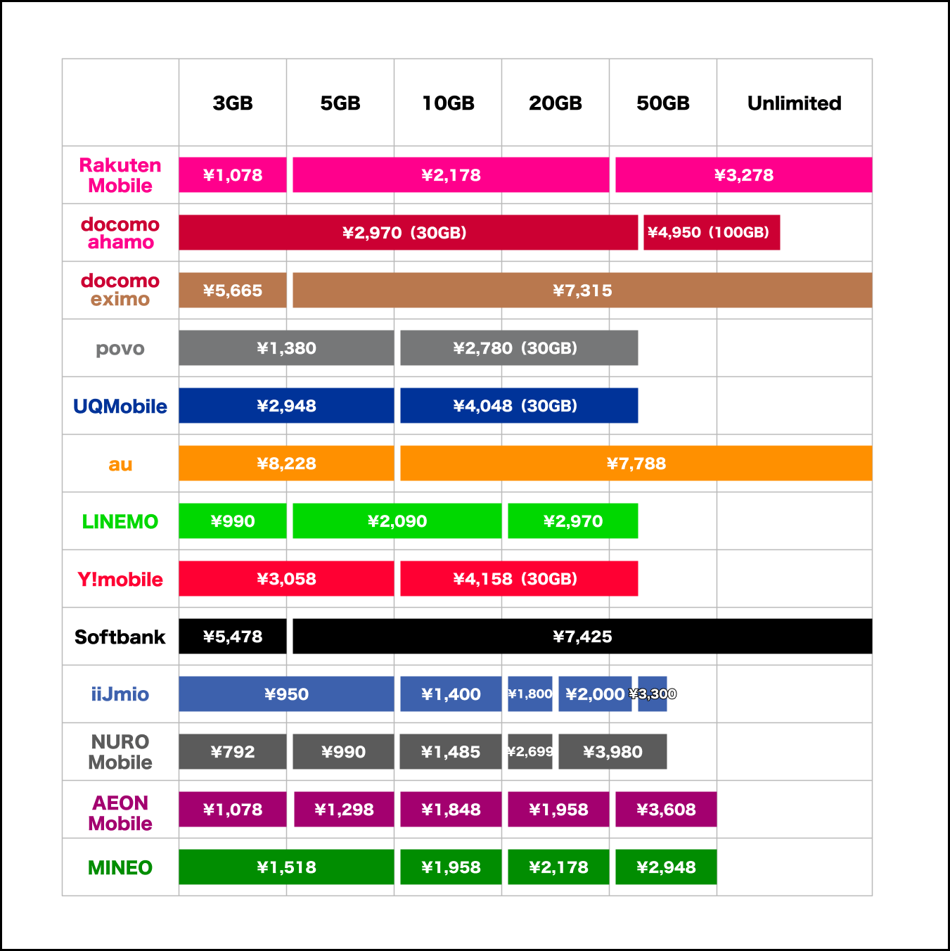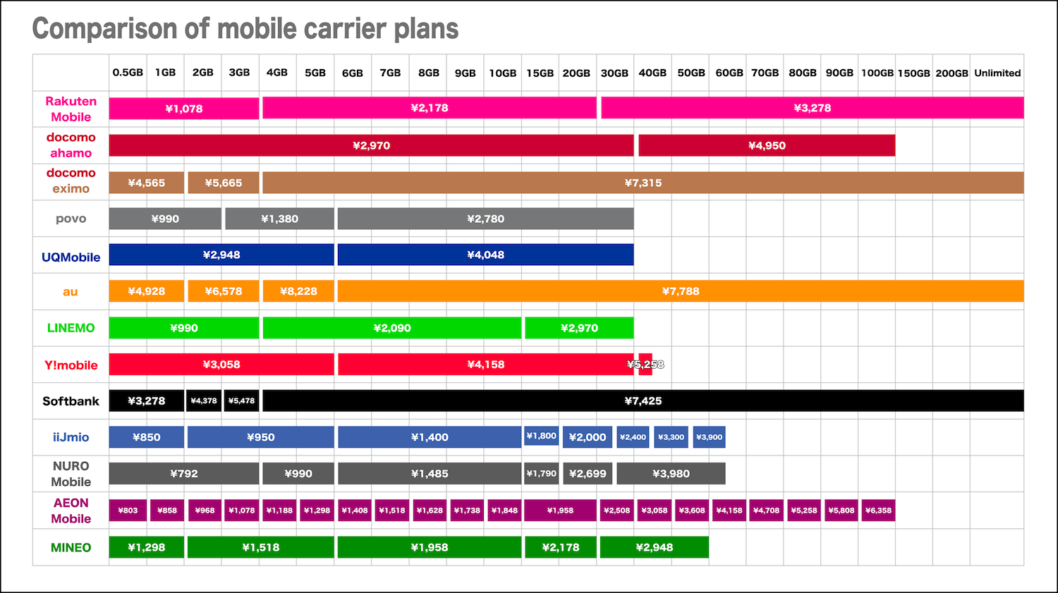 First, here’s a breakdown of nearly all major mobile carriers in Japan and their pricing.
