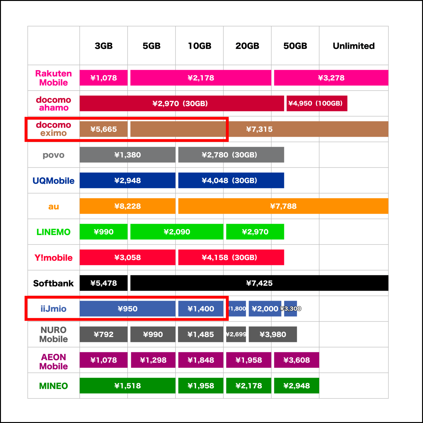 The 10GB plan on eximo costs ¥7,315, while IIJmio charges only ¥1,400.